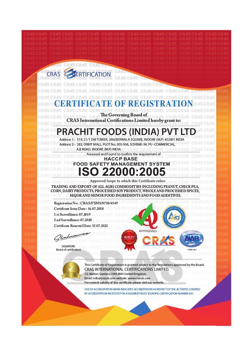 Prachit Foods is registered with ISO 9001:2015, ISO 22000:2005 with HACCP, FSSAI and APEDA. These certifications represent our genuine efforts to make every product and every technique in good favour of human and animal consumption.